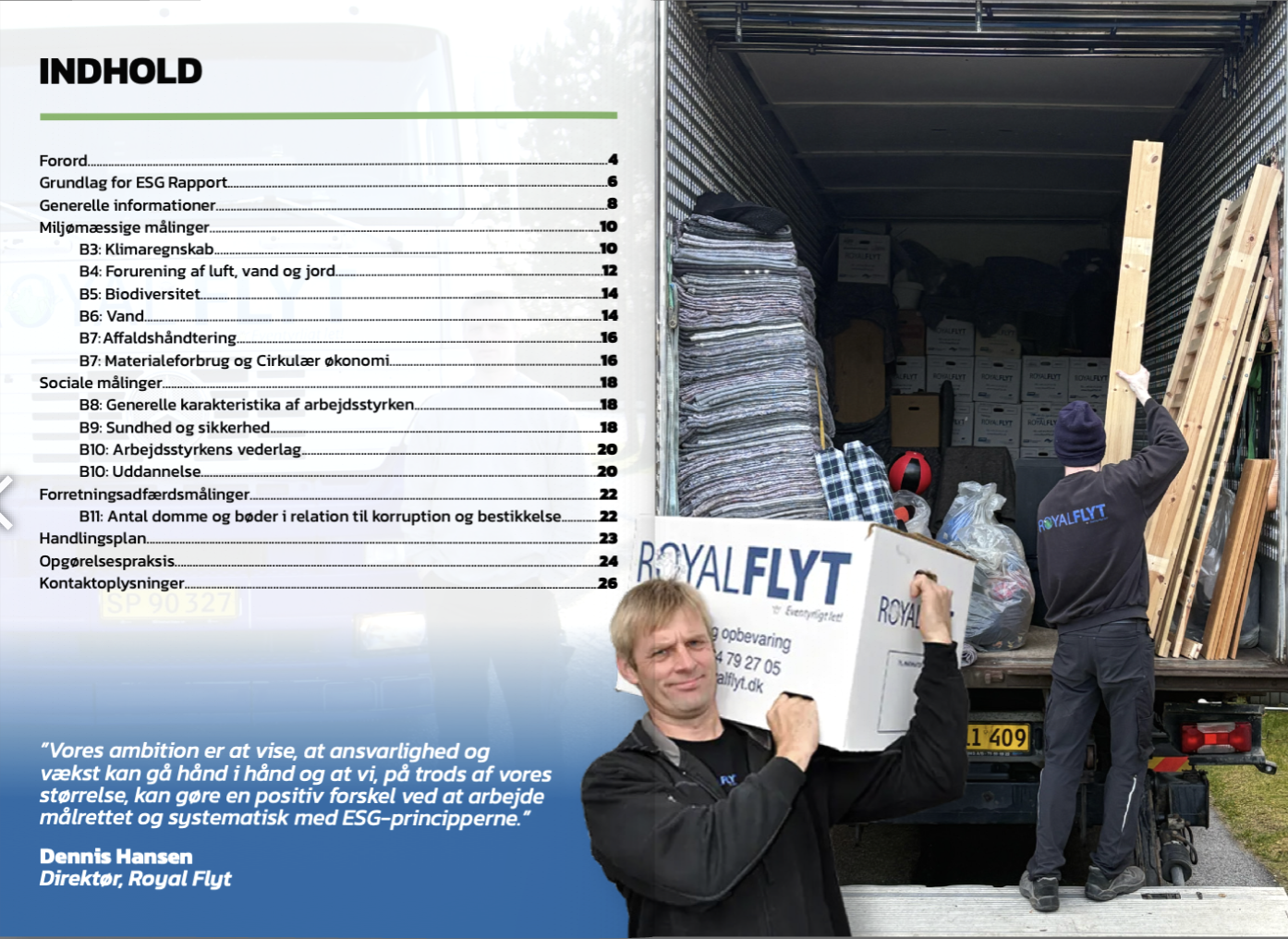 I 2025 tog vi det første skridt med ESG og deltog vi i virksomhedsprogrammet SMV:Grønne Kompetencer, hvor vi i samarbejde med rådgivningsvirksomheden Perspæktiv har udarbejdet vores ESG-rapport. Sammen har vi struktureret vores tilgang, indsamlet data og sat retning for, hvilke områder inden for miljø, sociale forhold og ansvarlig virksomhedsdrift der er mest væsentlige for Royal Flyt.