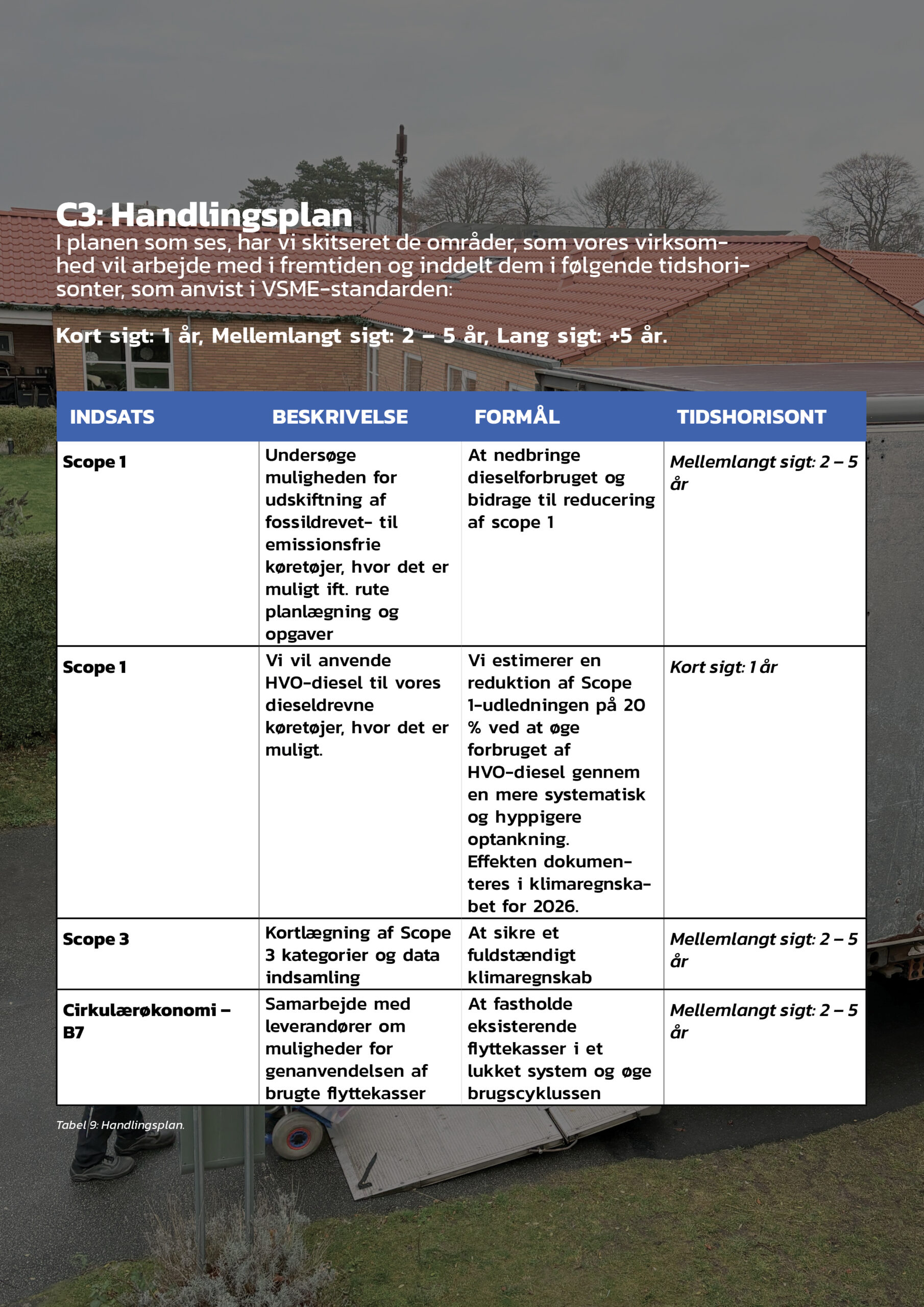 Som flyttefirma ligger vores største påvirkning typisk i transport, håndtering og materialeforbrug. Derfor arbejder vi målrettet med at reducere vores klimaaftryk, bruge ressourcerne mere effektivt og sikre et sundt og sikkert arbejdsmiljø – samtidig med at vi leverer en tryg og professionel flytning.