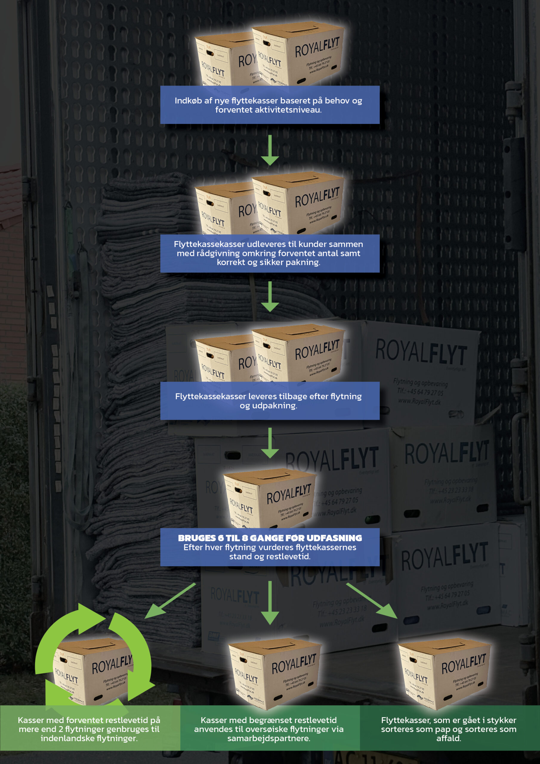 Vi arbejder med en takeback-ordning, hvor kasserne leveres tilbage efter flytningen og genbruges til nye opgaver. Det betyder, at flyttekasserne kan indgå i flere flytninger, før de udfases. Vi estimerer, at vores flyttekasser i skrivende stund typisk bruges 6–8 gange, inden den ikke længere er funktions dygtige.